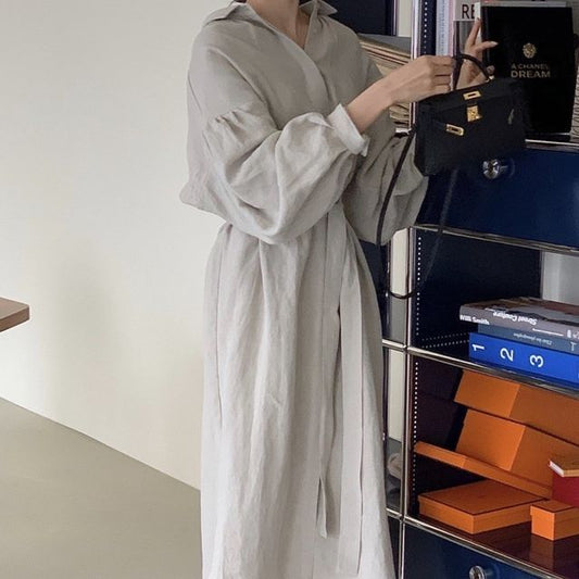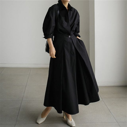 Puff-Sleeve Plain Midi Oversized Shirt Dress AO601