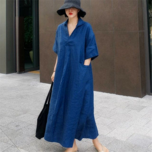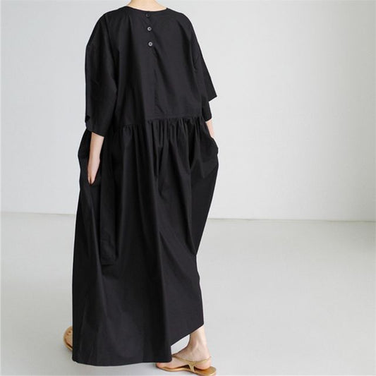 Elbow-Sleeve Collar Plain Maxi Smock Dress AO602