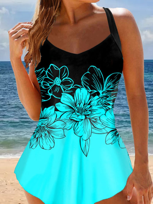 Vacation Floral Printing V Neck Swimdress Two-Piece Set QAP11