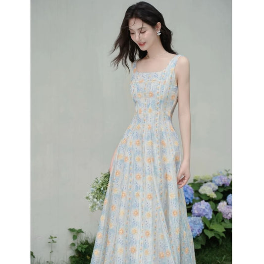 Sleeveless Square Neck Floral Print Midi A-Line Dress / Plain Open Front Crop Cardigan / Set