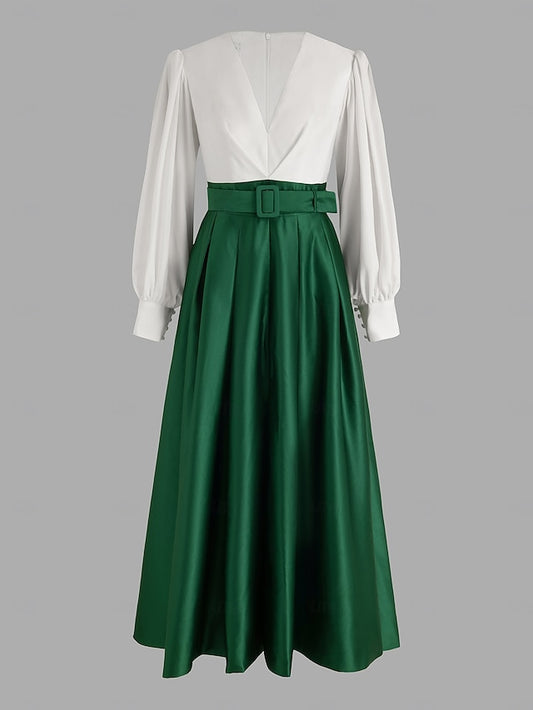 Long-Sleeve Tie-Neck Mock Two-Piece Faux Pearl Buttoned Midi A-Line Dress