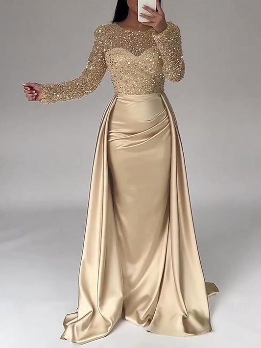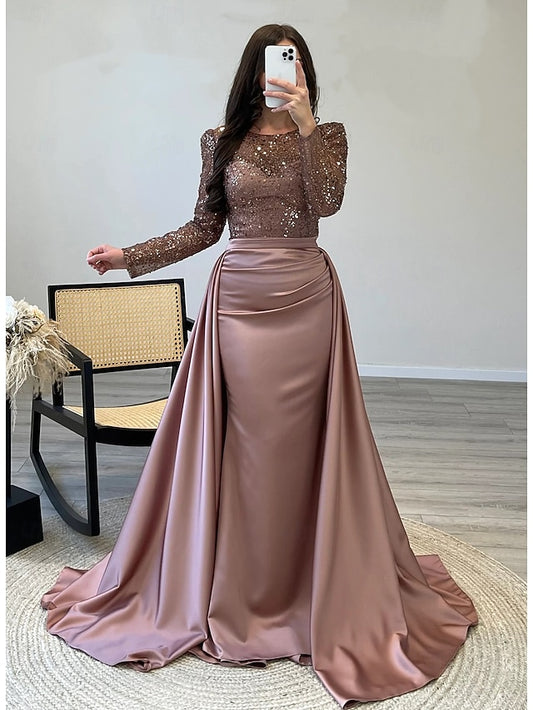Evening Long Dress Gown Mermaid RuchedSatin Sleeves Sequin