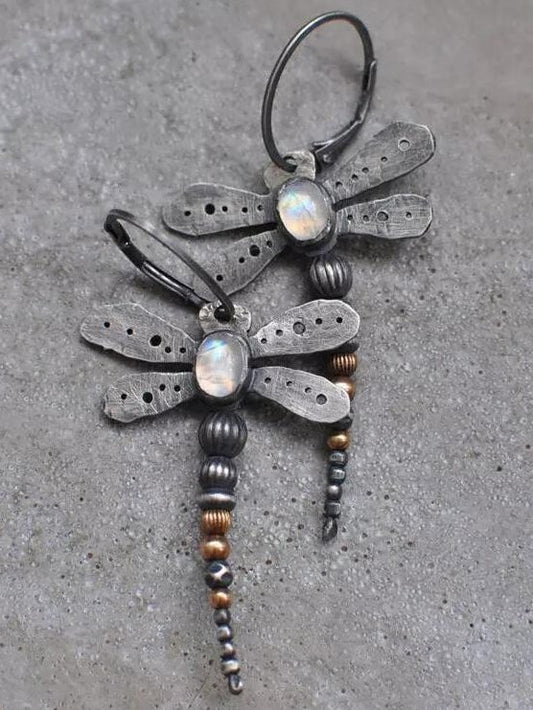 Vintage Silver Distressed Dragonfly Opal Moonstone Earrings Bohemian Ethnic Jewelry AH193