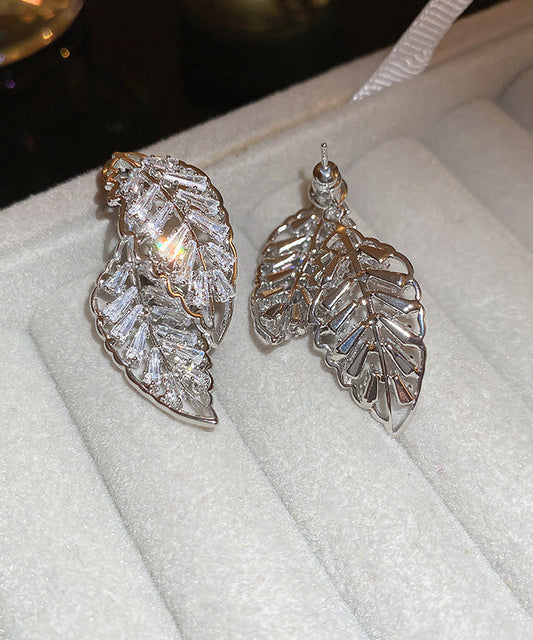 Gold Hollow Out Stud Leaf Earrings Zircon Fine Copper