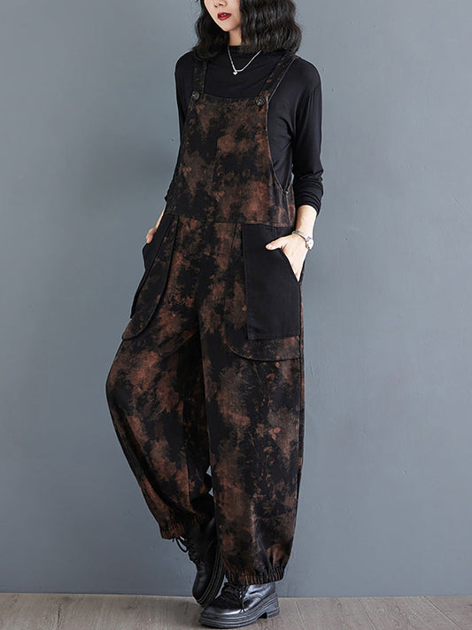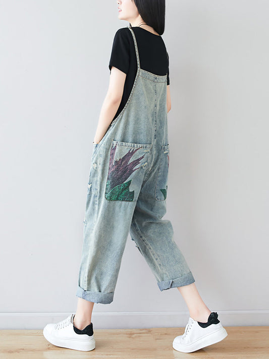 Women Autumn Artsy Flower Pocket Loose Denim Jumpsuits AI1071