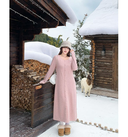 Long Sleeve Round Neck Lettering Embroidered Button Midi A-Line Dress
