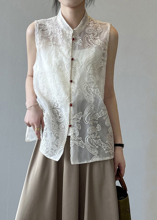 Boutique Beige Stand Collar Embroidered Tulle Waistcoat Summer VB1082