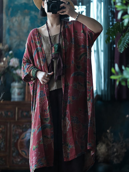 Women Summer Retro Floral Spliced Silk Long Shirt Coat QW1009
