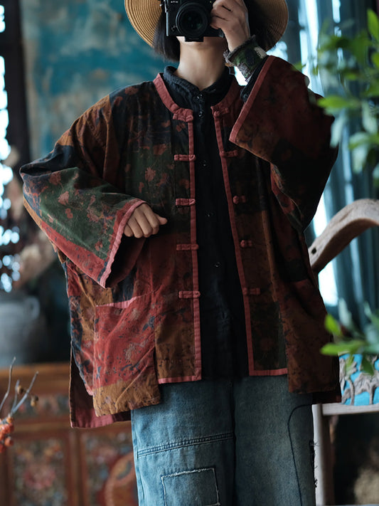 Women Vintage Spring Colorblock Flower Ramie Shirt Coat CO1031