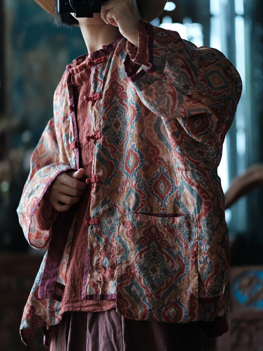 Women Vintage Spring Colorblock Flower Ramie Shirt Coat KL1035