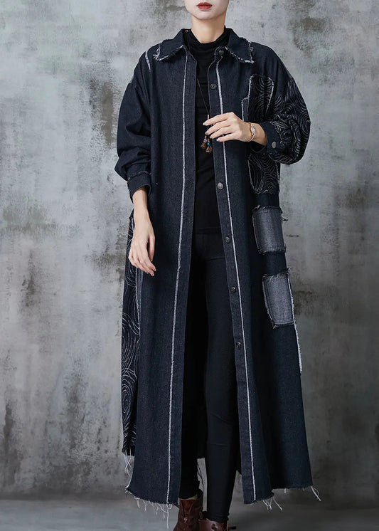 Classy Black Oversized Patchwork Applique Denim Coat Spring JK1028