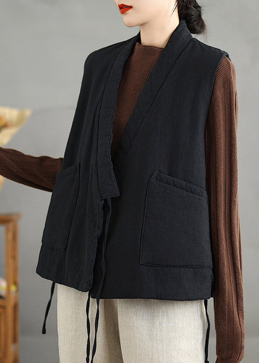 Retro Black Pockets Lace Up Fine Cotton Filled Vest Winter RU027