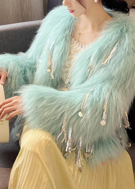 Italian Light Green Raccoon Hair Feather Tassel Coats Winter WV011