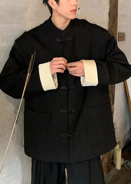 Boutique Black Stand Collar Button Pockets Men Coat Fall WJ032