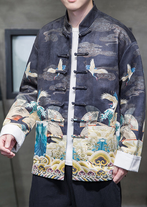 Blue Print Denim Men Coat Peter Pan Collar Fall WA018
