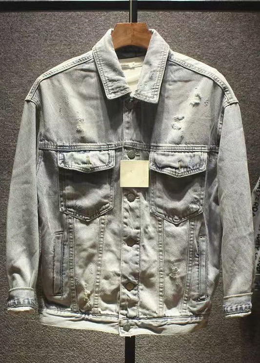 New Hole Print Pockets Denim Men Coat Fall WA021