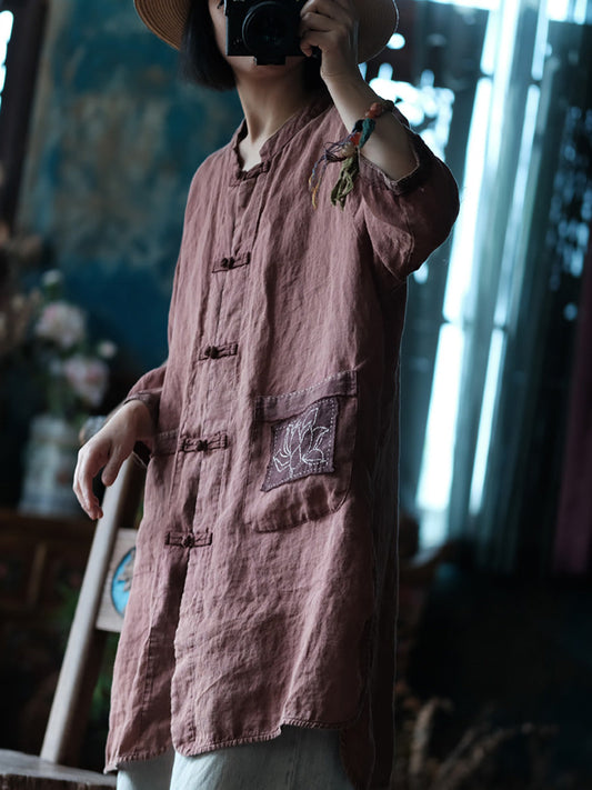 Women Summer Vintage Button-up Embroidery Linen Shirt Coat CC021