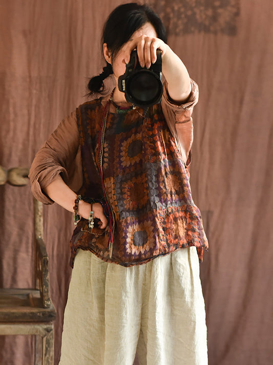 Women Summer Vintage Tie-dye Spliced Ramie Vest LL033