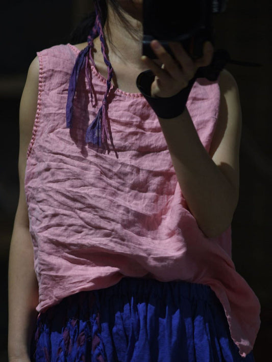 Women Summer Casual Solid O-Neck Loose Linen Vest CC052