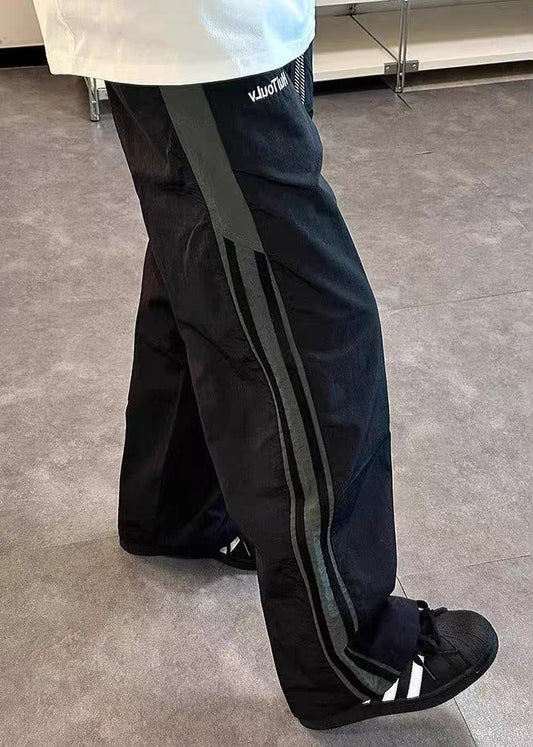Wide Striped Leg Pockets Cotton Pants Waist Elastic Mens Black