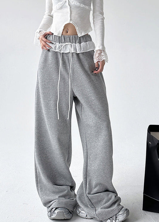 Loose Grey Lace Patchwork Elastic Waist Wide Leg Pants Spring TA056