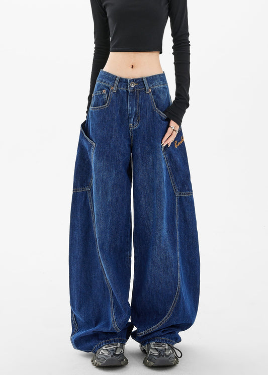 Loose Navy Pockets Wide Leg Denim Pants Spring TA058