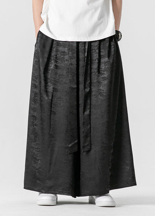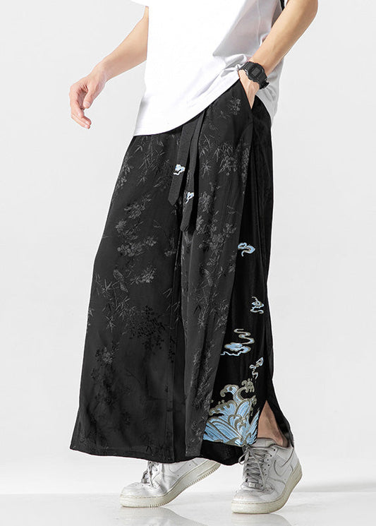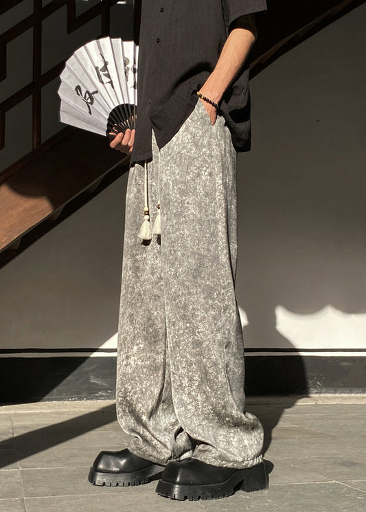 Chinese Style Pockets Print Ice Silk Men Wide Leg Pants Summer YT045