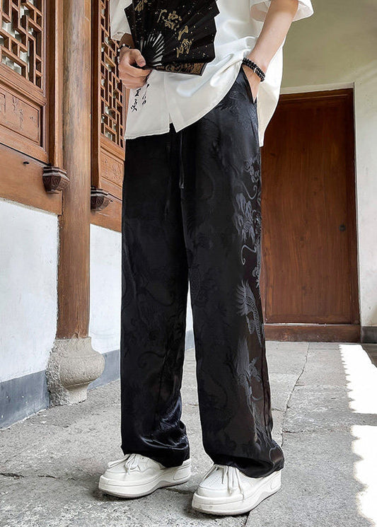 Chinese Style Black Pockets Jacquard Ice Silk Men Pants Summer YT052