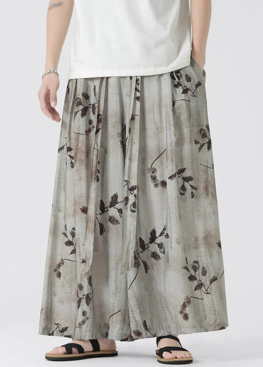 Cool Brown Pockets Print Ice Silk Mens Wide Leg Pants Summer YT044