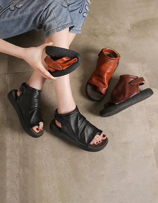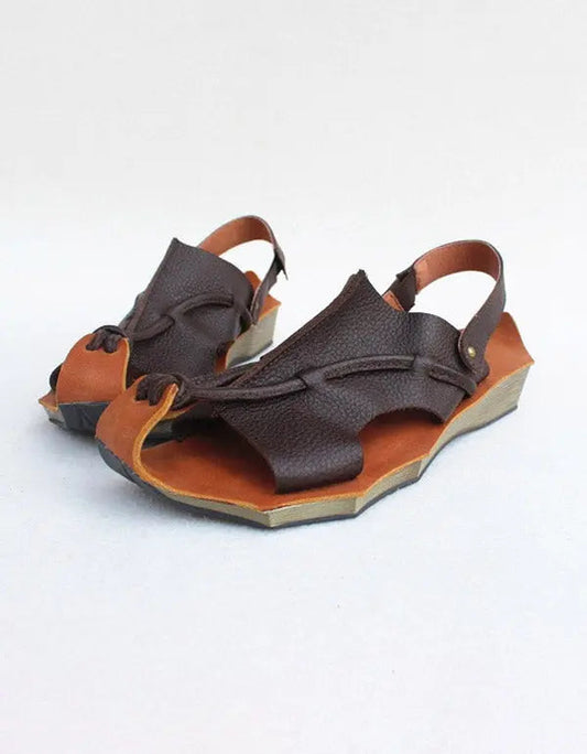 Brown Sandals Chunky Cowhide Leather Retro Splicing Buckle Strap