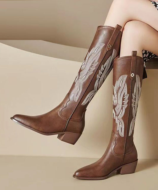 Brown Long Boots Embroidery Pointed Toe