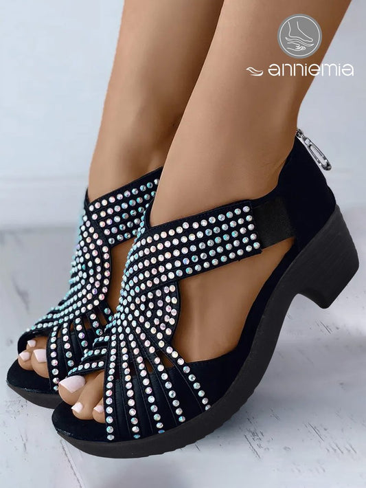 Black Rhinestone Hollow Peep Toe Chunky Heel Dress Sandals AH313