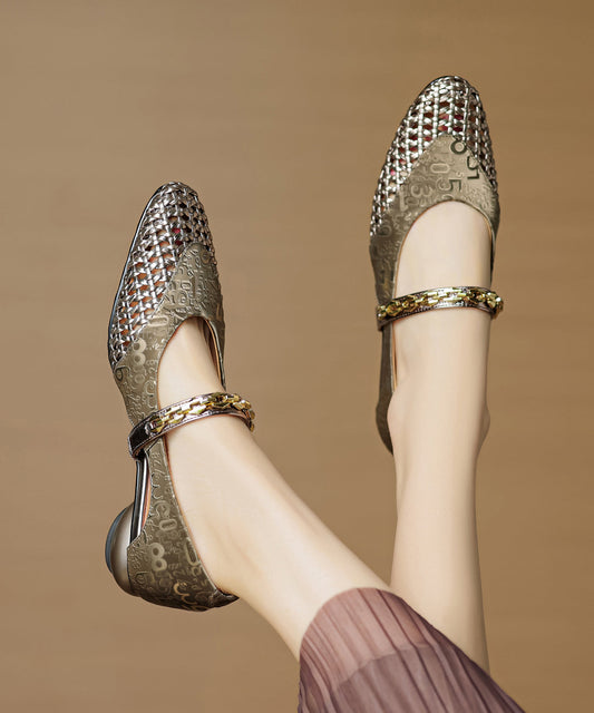 Leather Vintage Splicing Cowhide Out Chunky Shoes Green Hollow