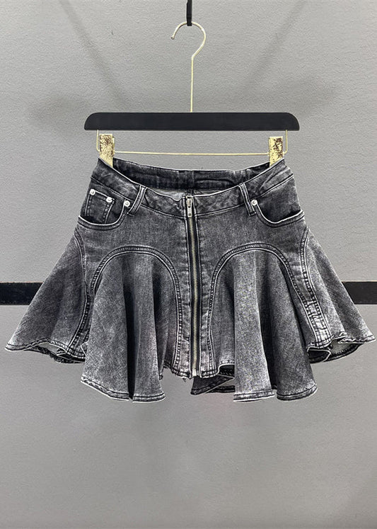 Denim Zippered Blue Ruffled Skirt Patchwork Summer French