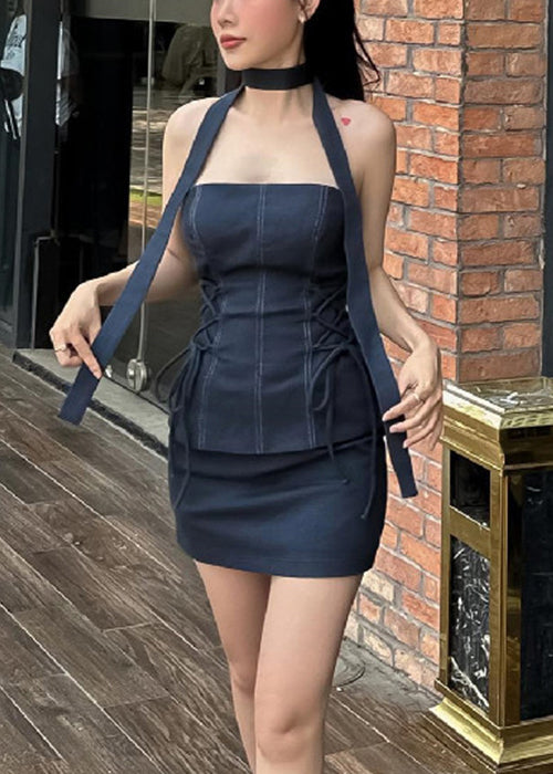 Slim Fit Black Strapless Lace Up Tops And Skirts Two Pieces Set Sleeveless YZ053
