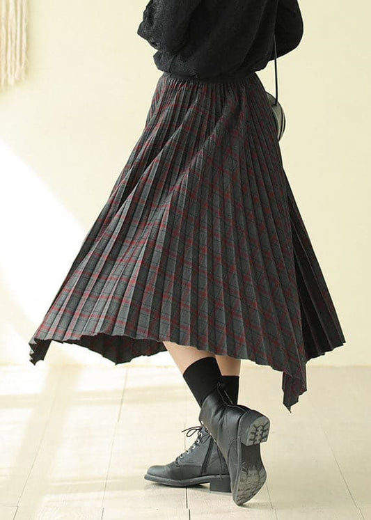 Women Chocolate Elastic Waist Asymmetrical Design Plaid Cotton Skirt Fall AJ1011