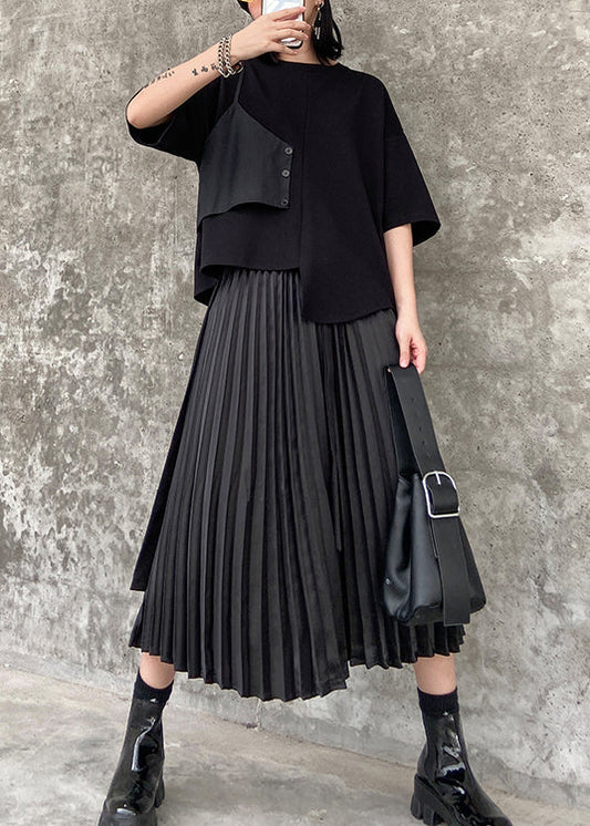 Loose Black Asymmetrical Patchwork Cotton Pleated Skirt Summer AJ1012