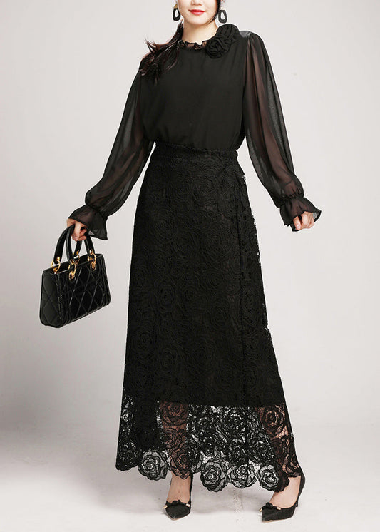 Black Lace Shirts And Maxi Skirts Two Pieces Set V Neck Long Sleeve AO1042