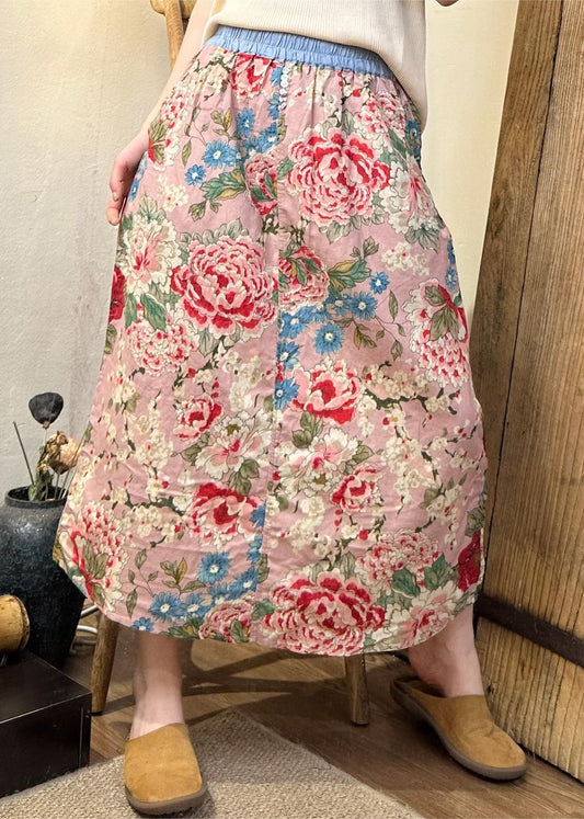 Loose Apricot Print Pockets Elastic Waist Cotton Skirt Summer JH017