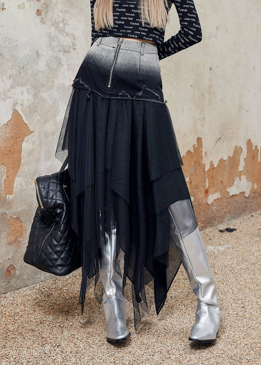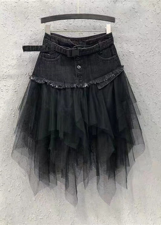 Stylish Black Asymmetrical Tulle Patchwork Denim Skirt Spring QQ1058