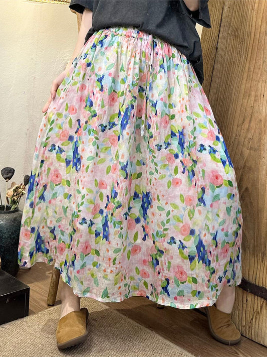 Women Summer Artsy Floral Dual-layer Ramie Skirt BN1041