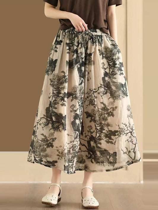 Women Vintage Leaf Flower Ramie Loose Skirt SC1042
