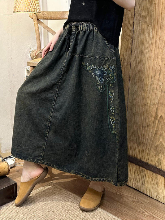 Women Artsy Flower Embroidery Denim Skirt CO1053