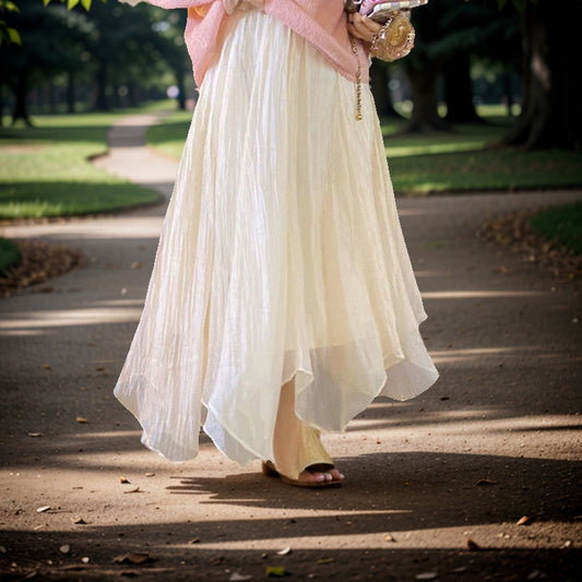 Simple Beige Asymmetrical Wrinkled Elastic Waist Chiffon Skirt Summer AB1013