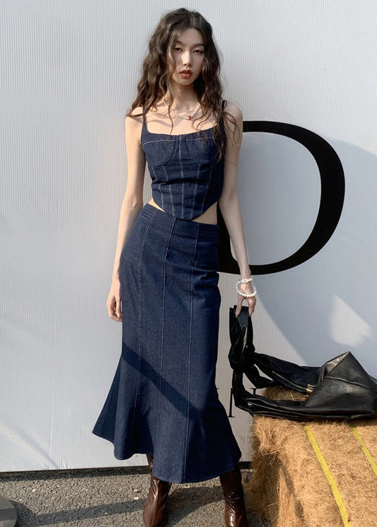 Women Navy Slim Fit Patchwork Denim Tops And Skirts Two Pieces Set Summer LY7728