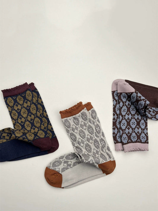 3 Pairs Women Autumn Flower Jacquard Colorblock Socks AH1023