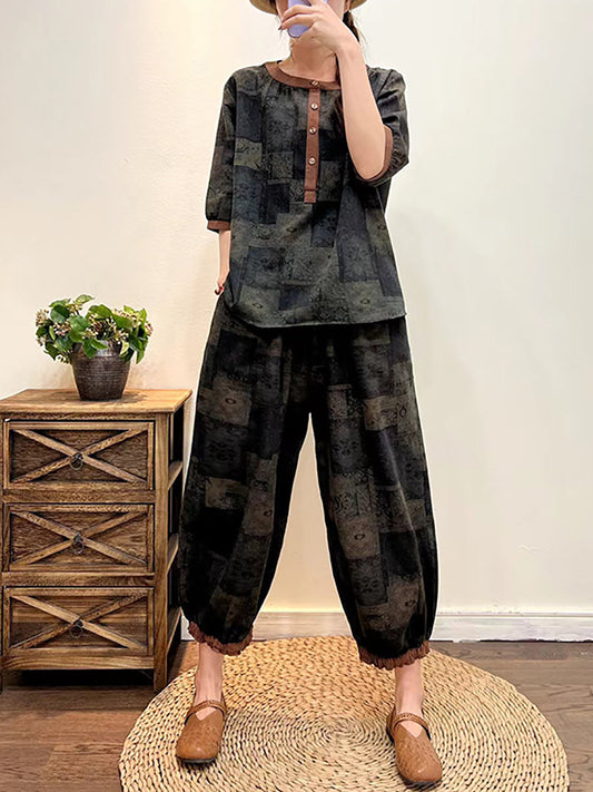 Plus Size Women Vintage Print 100%Ramie Long Shirt+Pants ZZ1056
