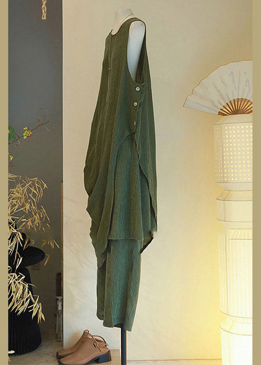 Button Cotton Set Sleeveless Asymmetrical Two Pieces Women Green