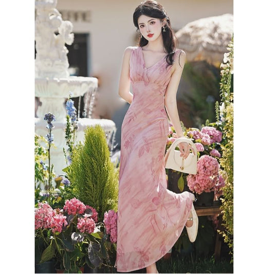 Sleeveless V-Neck Floral Maxi A-Line Sundress / Cardigan / Set