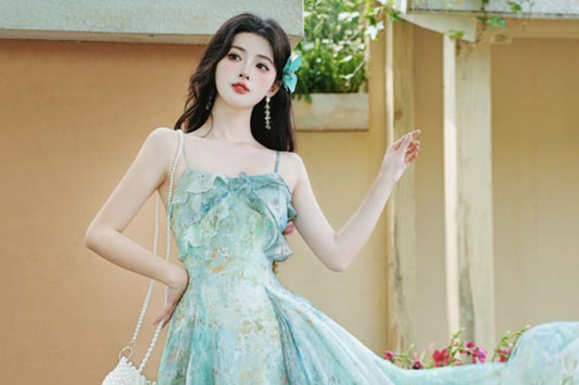 Spaghetti Strap Floral Print Ruffled Midi A-Line Dress / Cardigan / Set